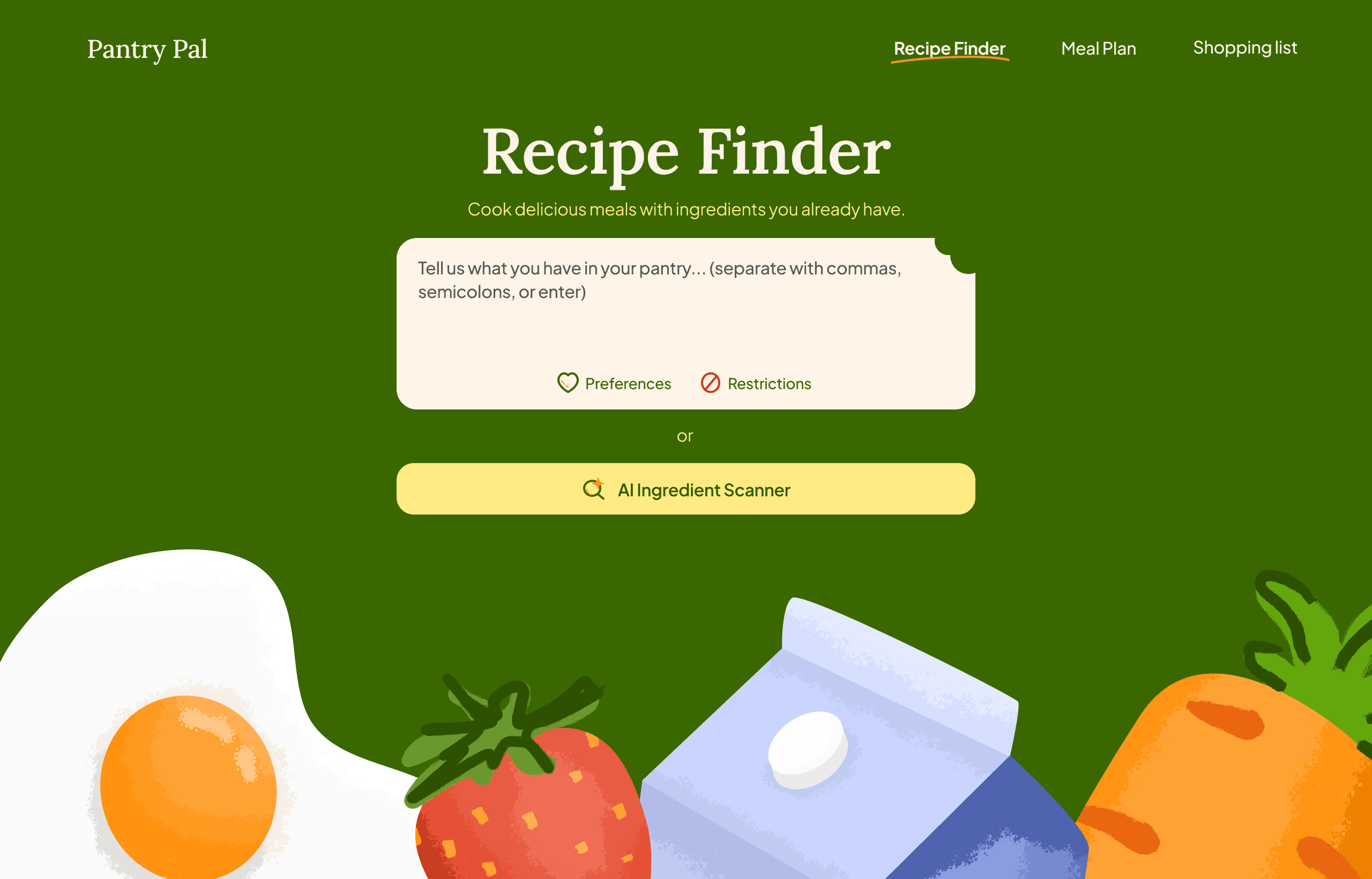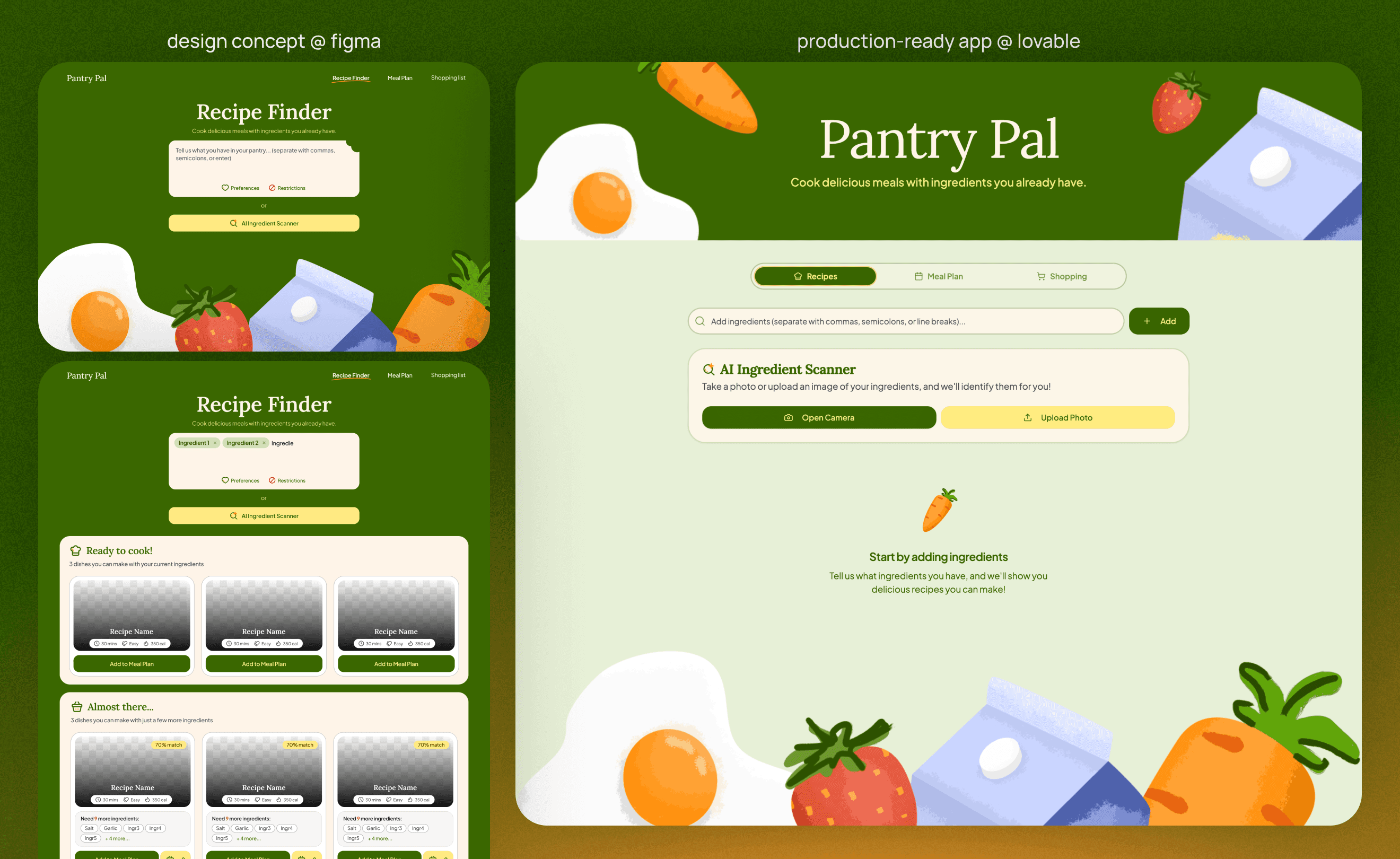 Vibe coded using Lovable, implemented Claude Sonnet 4 (ingredient scanning) and Edamam Recipe API